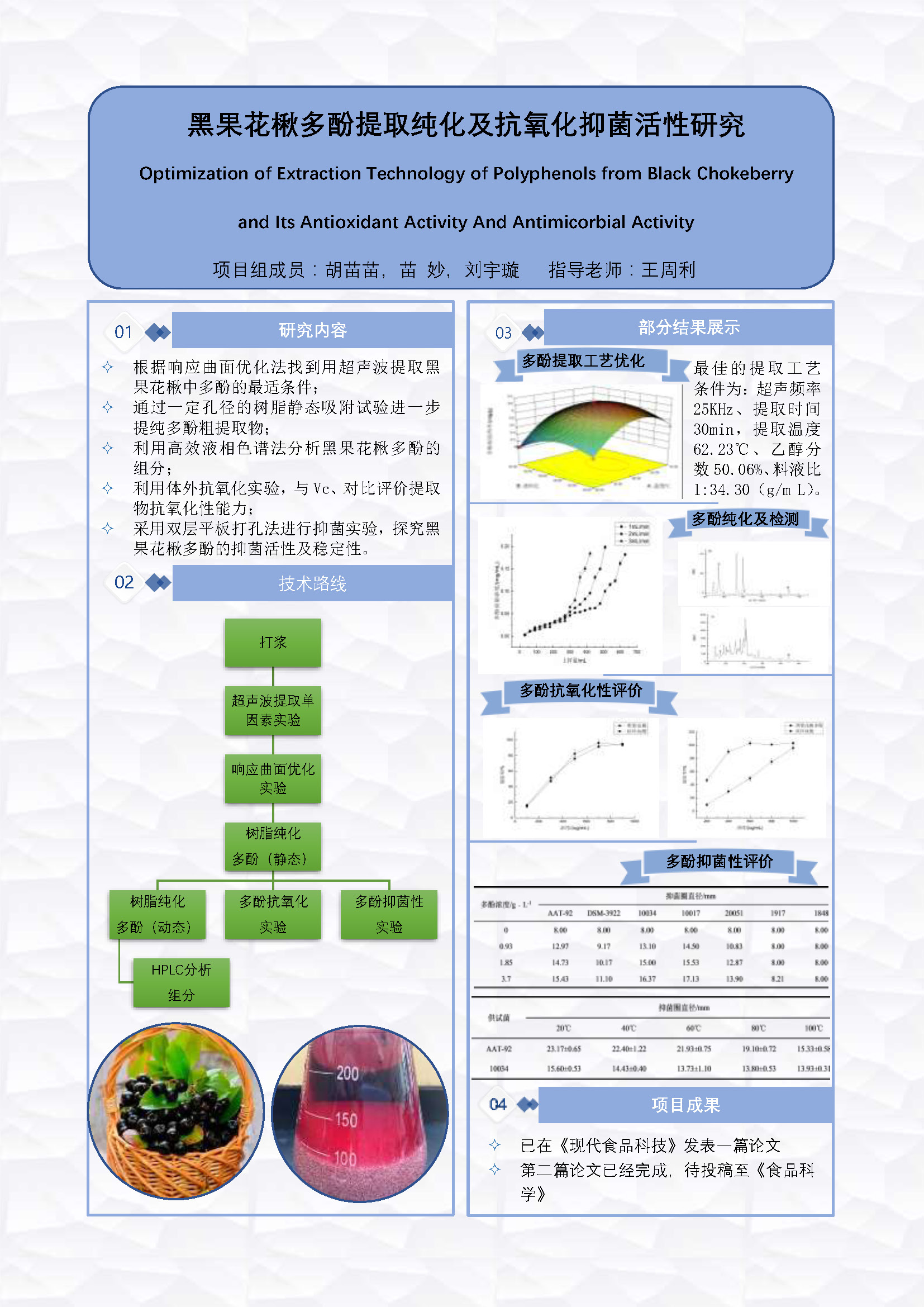 37 | 黑果花楸多酚提取纯化及抗氧化抑菌活性研究 | 食品学院 | 胡苗苗 | 苗 妙 刘宇璇 |