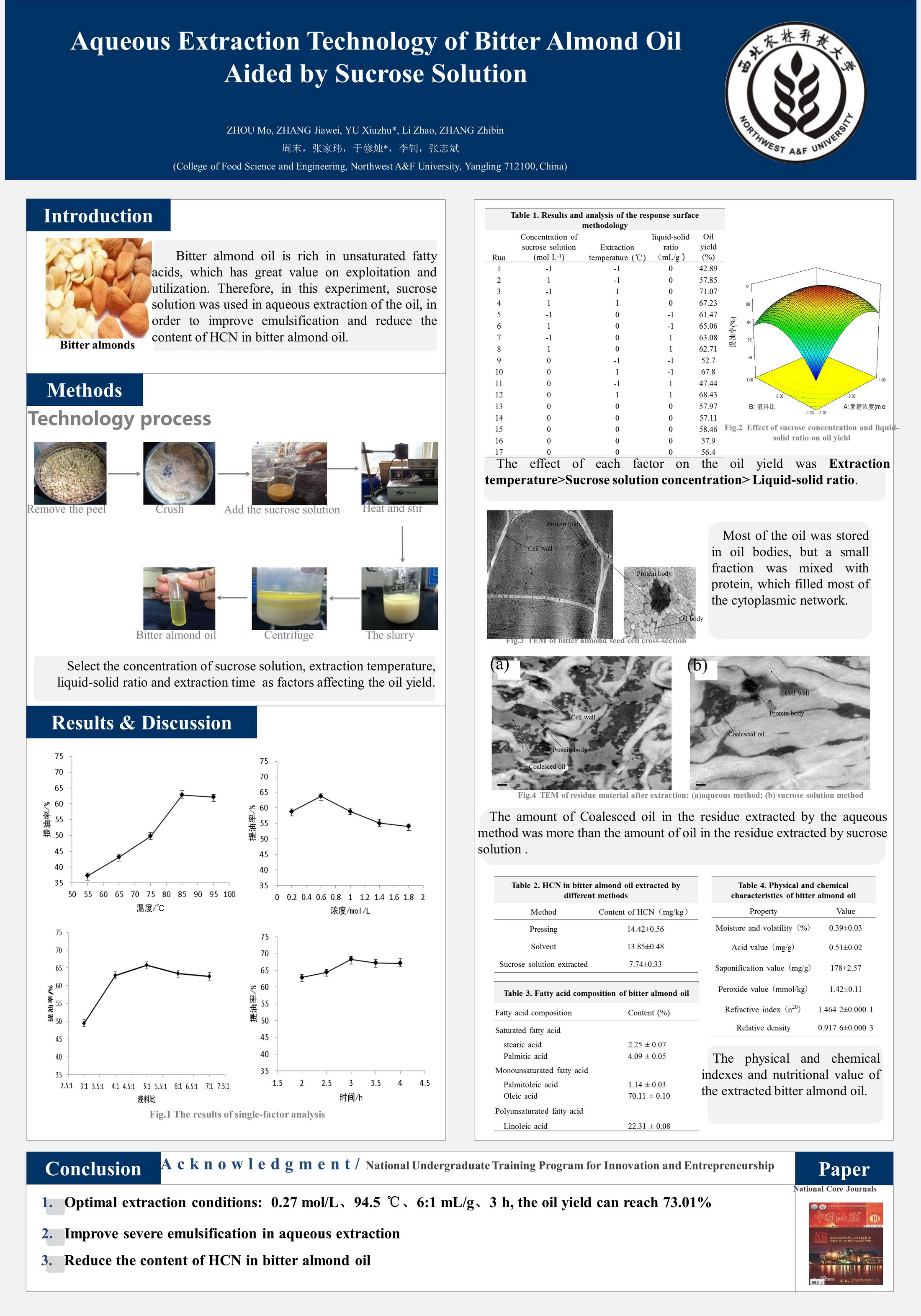 15 | Aqueous Extraction Technology of Bitter Almond Oil Aided by Sucrose Solution | 食品学院 | 周 末 | 张家玮 李 钊 张志斌 |
