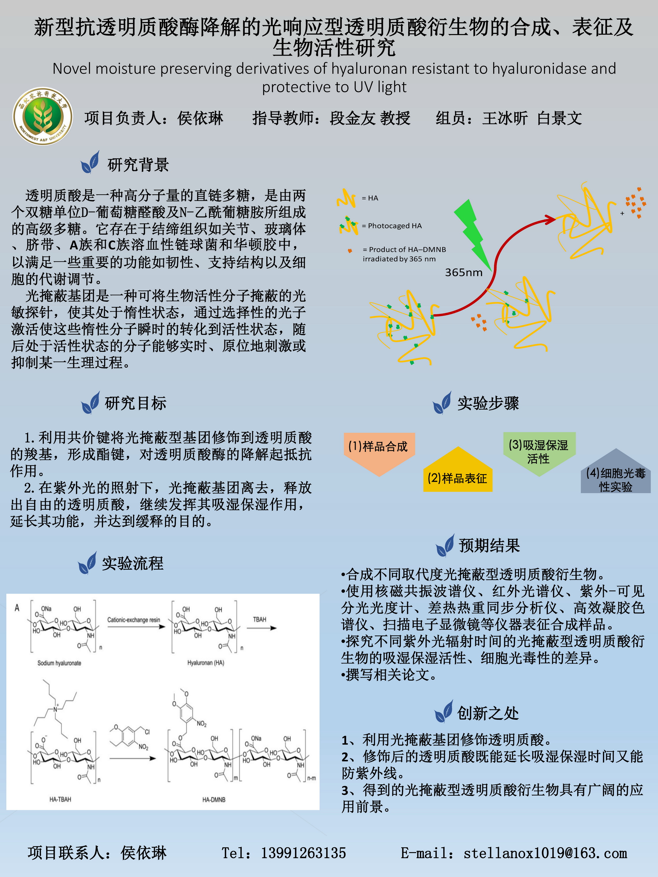 41 | 新型光响应型抗透明质酸酶降解的透明质酸衍生物的合成、表征及生物活性研究 | 创新学院 | 侯依琳 | 王冰昕 白景文 |