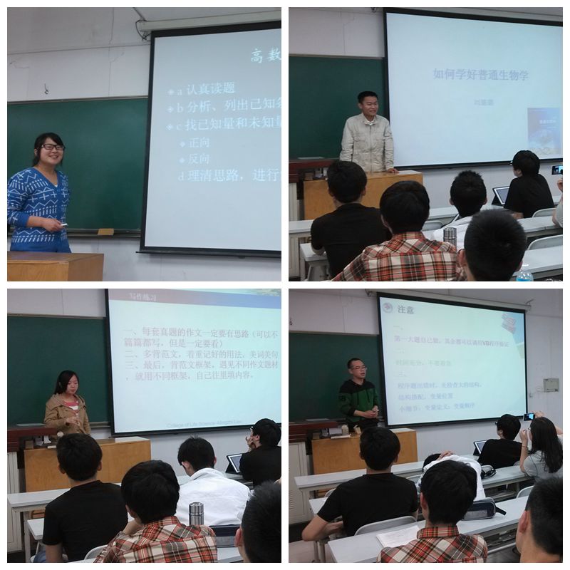 谈到高等数学学习,生工基地班党亚萍建议学弟学妹们在学好课本知识的基础上要多做习题,达到灵活运用所学数学公式定理的目的;谈到英语及四六级备考,生工基地班王银娟告诫2013级同学英语学习贵在坚持,要逐步养成每天听一篇英语新闻、读一篇英语文章、写一篇英语作文的良好习惯,同时强化考前备考,四六级就很容易能够拿下了;谈到普通生物学学习,生工基地班刘璐璐提醒学弟学妹,普通生物学中有很多知识点是需要记忆的,建议大家可以利用对比记忆法、图形记忆法等适合自己的方法来提高学习效率;高年级学生还就2013级学弟学妹们关心的如何处理好学习工作和生活关系等问题进行了耐心解答,经验分享会在同学们热烈的掌声中圆满结束。