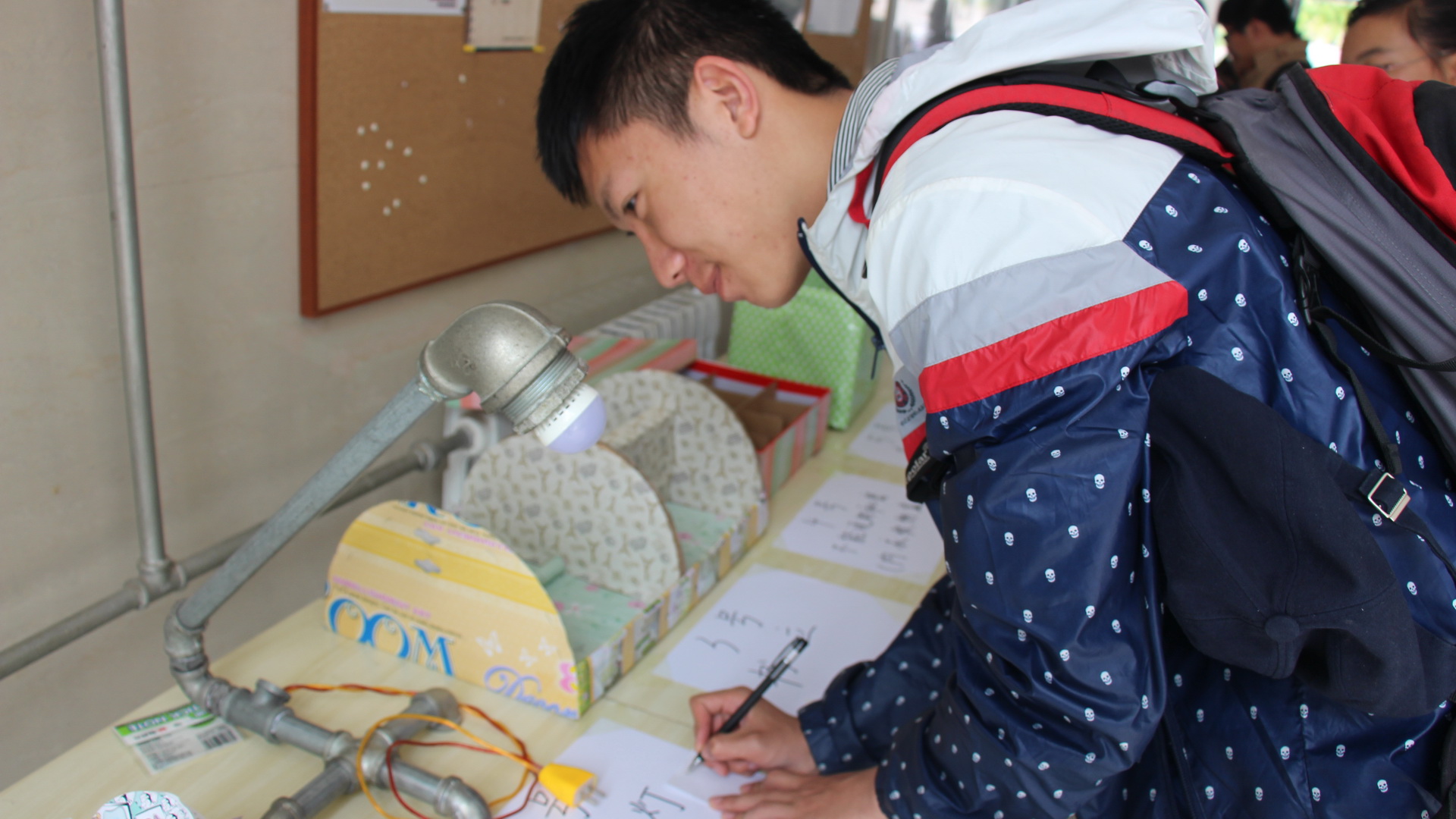 活动分两部分进行。“最新作品我来选”环节,学生们将用废弃资源制作的工艺品向大家展示,并解说作品的用途和制作方法,书院学生根据作品的利用价值和创新性进行投票,选出实用创新性作品。最终,2014级生工141班晁爽同学的”钢管台灯”获得第一名。“保护地球我代言”环节,书院学生积极参与,认真写下保护地球的标语,表明在今后的时间里,保护地球,从自身做起。活动现场气氛热情高涨。