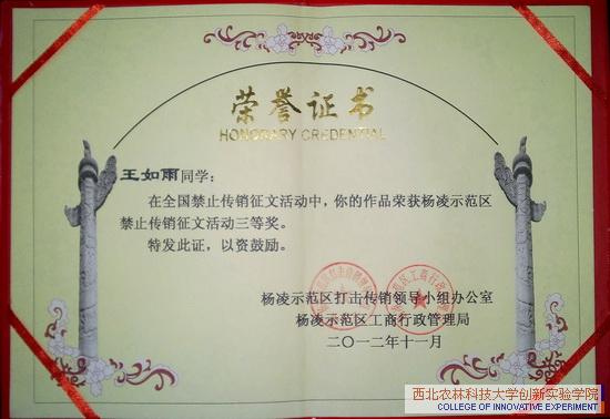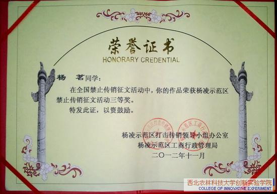 近日,在全国禁止传销征文活动中,我院王如雨、李长圣、杨茗等三名同学喜获获杨凌示范区禁止传销征文活动三等奖。