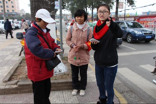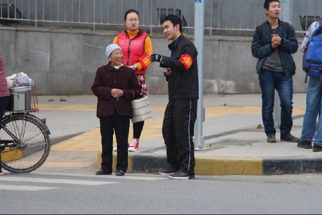 活动中,志愿者们在接受了交警简单的岗前培训后,就带上印有“交通协管员”字样的袖章按分工走上各自的工作岗位,在西农路与康乐路十字路口东西南北每一个方向都有至少两名志愿者担任文明交通协管员,在进行文明交通劝导的同时呼吁广大市民积极响应“安全出行,方便你我”的号召。对于每一个试图闯红灯或者其他违反交通规则的行为,志愿者们均会及时上前进行善意的提醒和劝导,绝大多数市民对于志愿者们的工作也都给予配合,有的还表达出了高度的赞赏和肯定。对于一些年迈的老人,志愿者们主动耐心地帮助其安全过马路,并为其讲解交通安全知识。“请您走人行道”,“现在还是红灯”,“请您等一下好吗?”“可以过马路了,请注意安全”…….这样的声音一遍又一遍地回荡在西农路与康乐路十字路口,为行走在路上的人们带来了安全的提醒和便利的帮助。