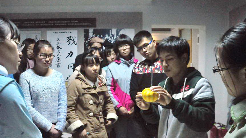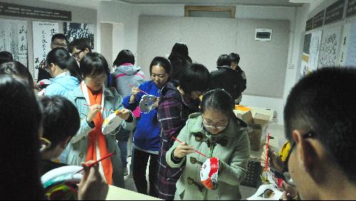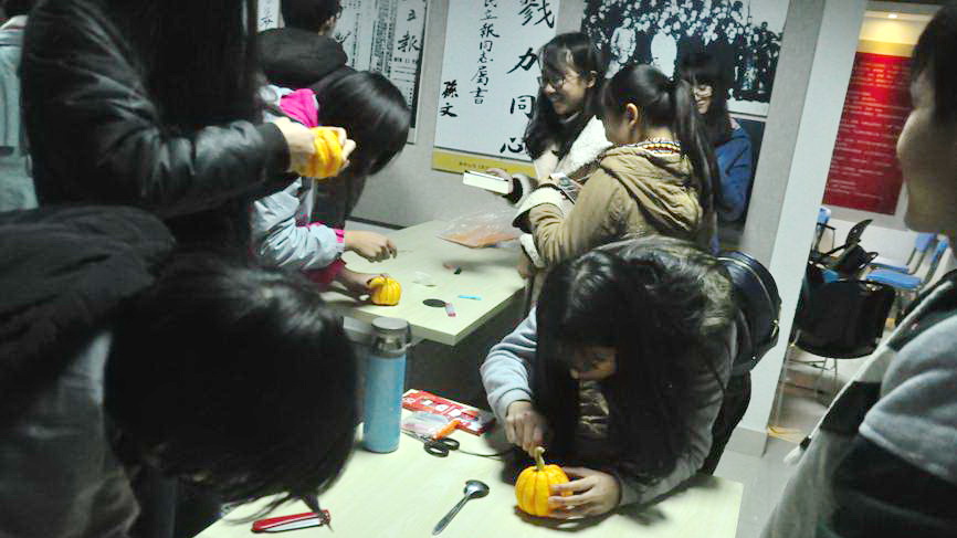 励志坊里,李璐同学讲述了中西方人们心中的鬼神形象,使同学们深入了解了中西方文化的异同。随后,同学们相互分享了自己接触到的关于文化差异方面的小故事。接下来,在雕刻小达人相龙同学的带领下,同学们开始绘制面具和雕刻南瓜。经过同学们认真的体会,细致的描绘,一张张鲜活的“鬼怪”面具便呈现出来,而南瓜灯的设计则体现出同学们独具创意的构想与娴熟的雕刻技能。同学们迫不及待的点燃了自己的南瓜灯,灯中摇曳的火光带来了温馨与满足。