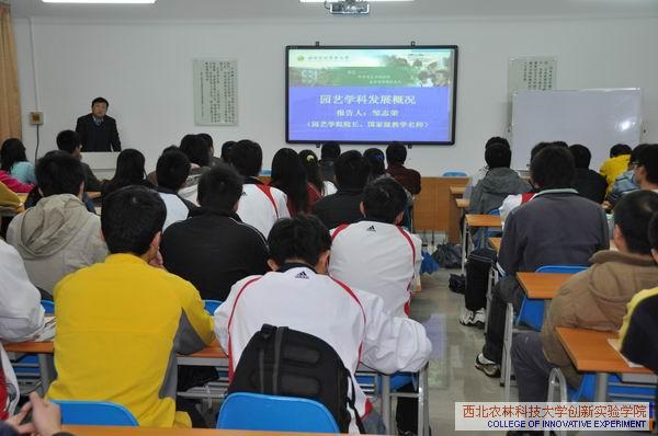 3月31日晚,我校园艺学院院长、国家级教学名师、博士生导师邹志荣教授应邀在我院多媒体教室做了题为“园艺学科的发展概况”的学术报告。学院2008级植物科学大类近百名学生到场聆听了报告。报告会由学院副院长王军主持。