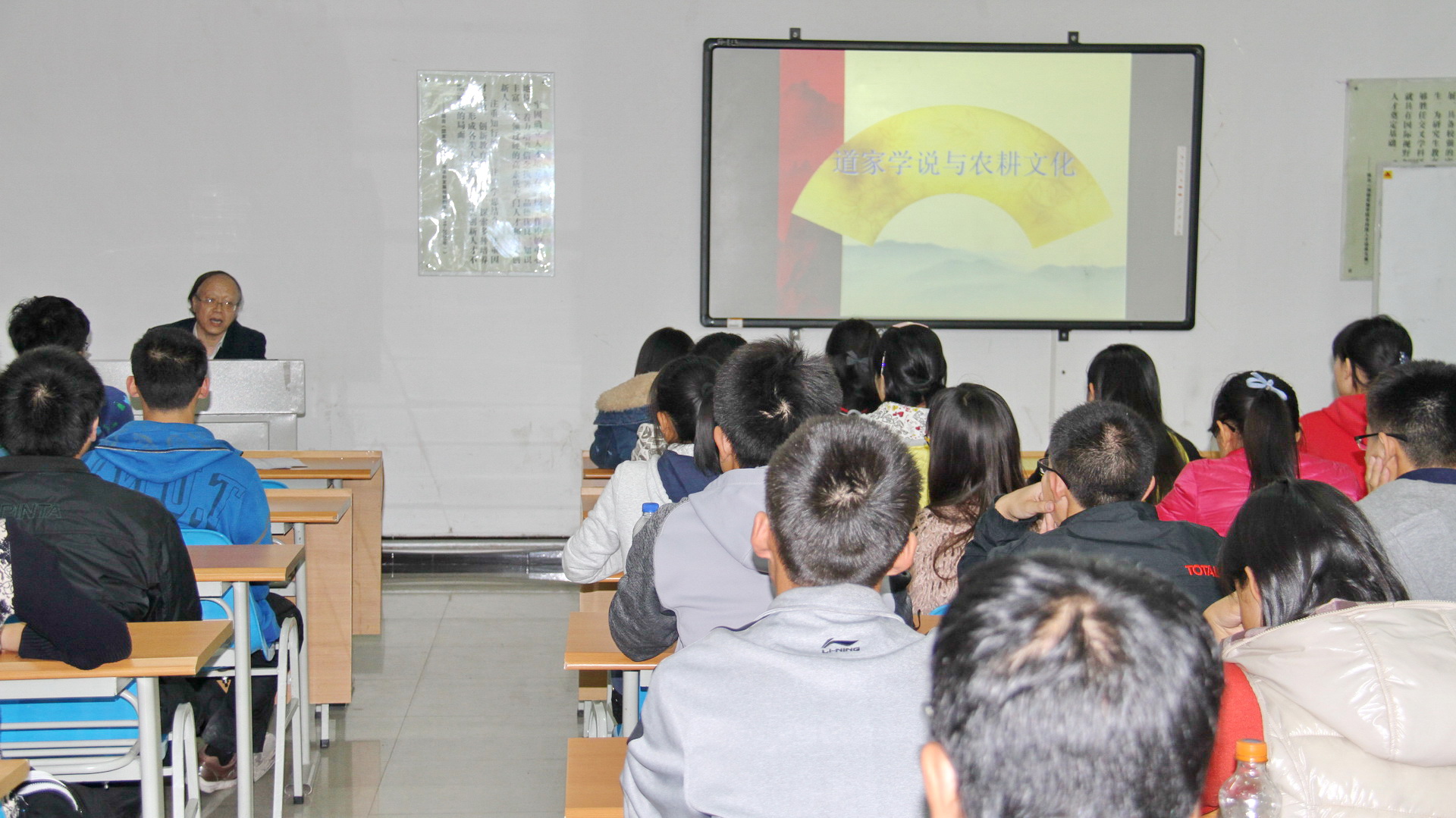樊志民教授从“国学讲堂”和本次题目的背景切入,阐述了传统文化与人全面发展的关系。他从道家的起源开始,向大家细细阐述了道家学说与农耕文明的进程,以对比的手法简述了儒、法、墨、朱等学派的思想精华,突出了道家学说对农业的独特影响。整场讲座学术气氛浓郁,拓宽了同学们的文化视野,提高了同学们对于国学的理解,同学们纷纷表示受益匪浅。