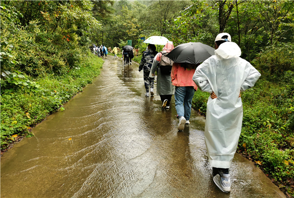 9月3日上午,雨开始小一点,老师们组织同学抓紧去野外,我也跟随其中。这支队伍由生命学院赵亮老师、刘虎岐老师,林学院侯琳老师和资环学院代允超老师4位带队老师团队授课,他们冒着雨,耐心细致给同学们讲解,全体师生的鞋都湿透了,有的学生裤子都湿了大半截,但老师们很敬业,同学们也学习得很认真,边听边用手机做笔记。