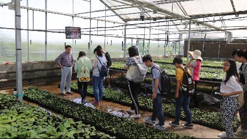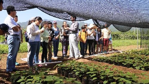 到达目的地之后,由我校资源环境学院杨开宝教授给同学们讲解。杨老师首先把同学们带到猕猴桃基地的眺望台,在这里整个猕猴桃基地尽收眼底。猕猴桃基地分为种苗繁育区、新品种选育区、新技术展示区、主栽品种试验研究区、种质资源收集保护区这五个区,杨老师带领我们依次参观了每一个区。