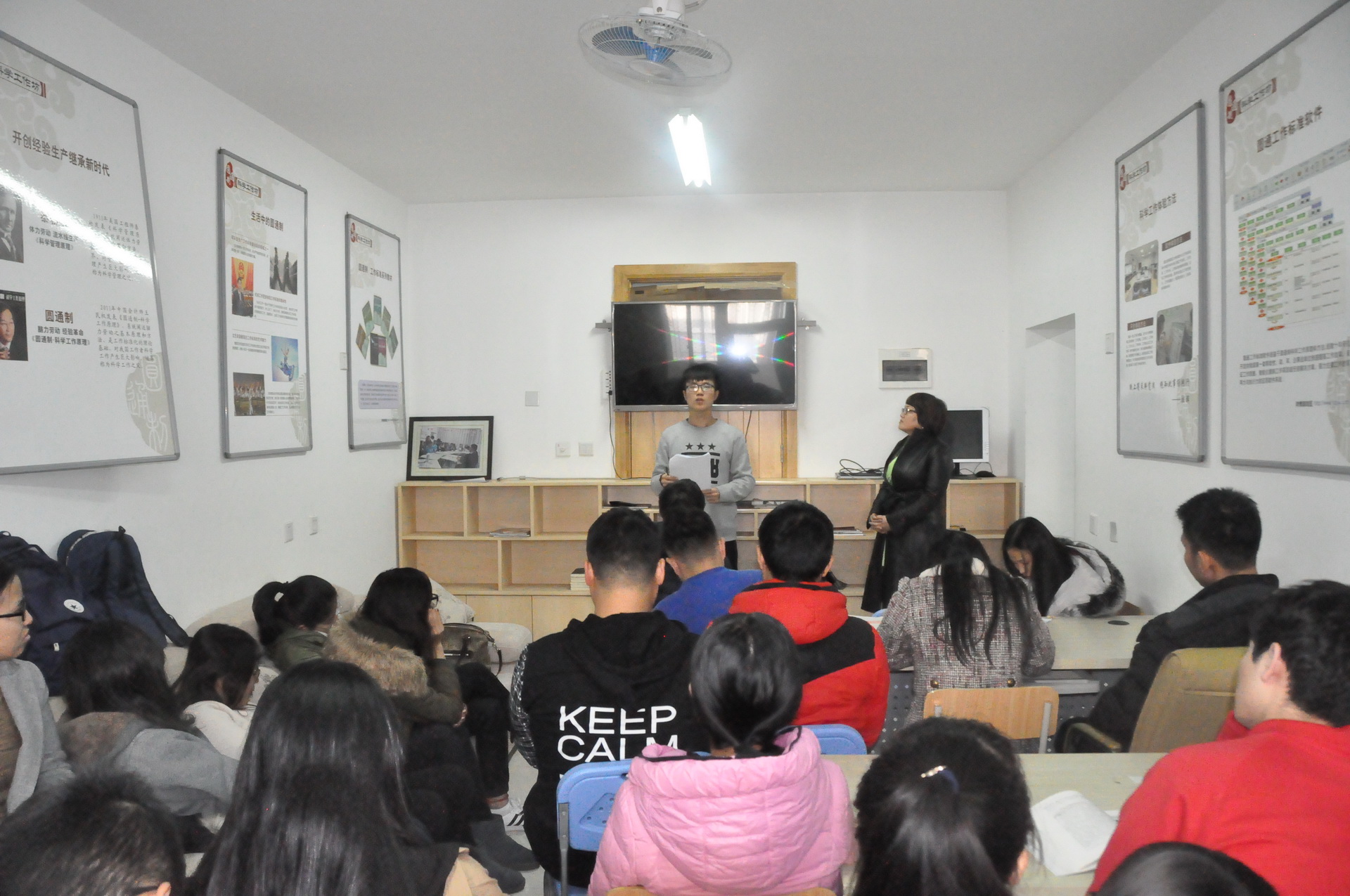 12月7日上午,我院在右任书院开展了教学任务约定课程<<毛泽东思想和中国特色社会主义理论体系概论>>的开放式教学活动。本次教学活动由邓谨老师主持, 2015级4个班级的全体学生参加了本次课程。我院党总支书记李海华,院长欧文军,副院长王小平,以及来自马克思主义学院的曲恩道老师、王海成老师、胡红老师共同参与了课堂教学活动。